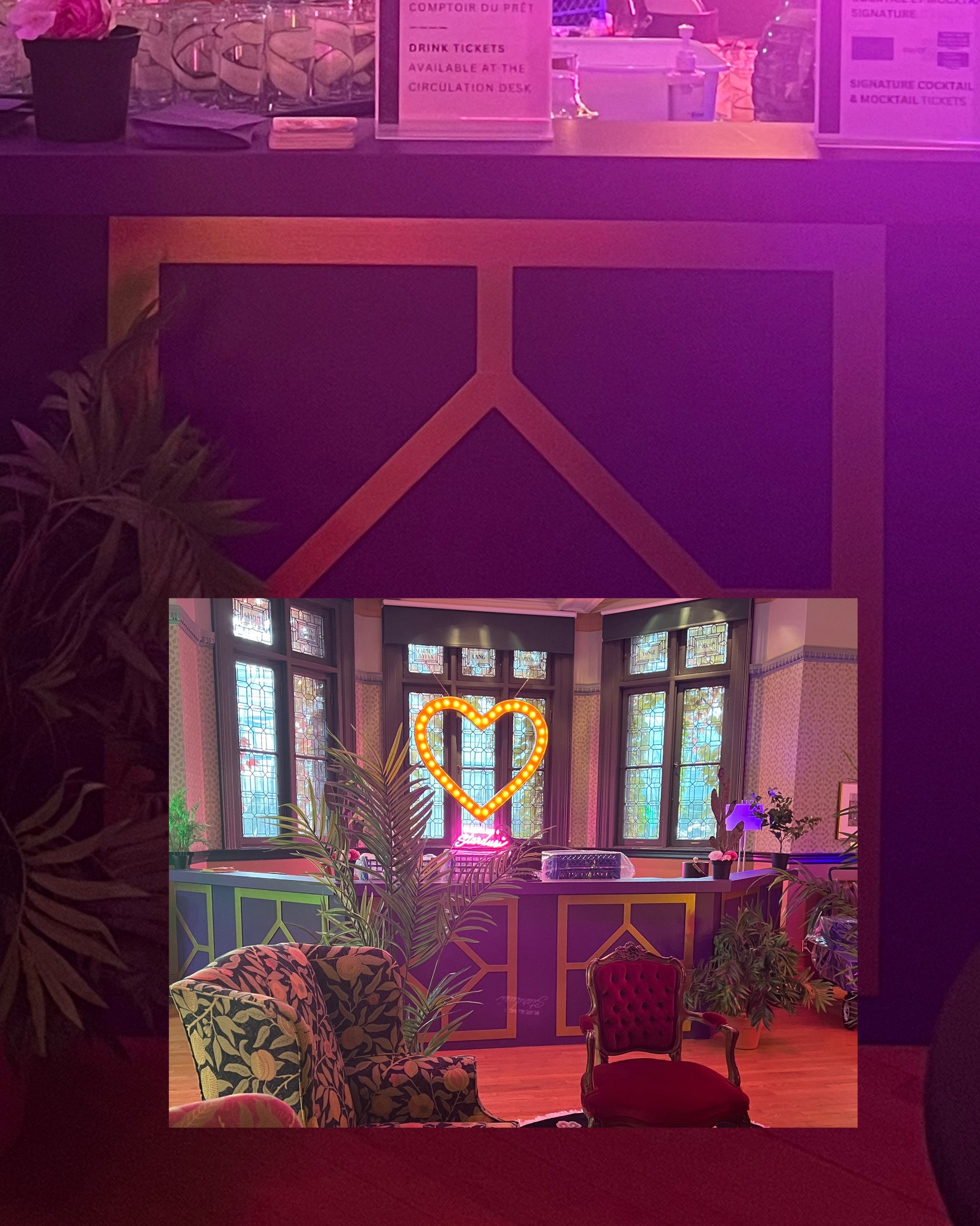 Grand bar avant violet foncé avec des détails art déco dorés. Peut être utilisé avec des tables pliantes ordinaires à l'arrière. Nous pouvons inclure des tables pour l'arrière du bar moyennant un supplément.