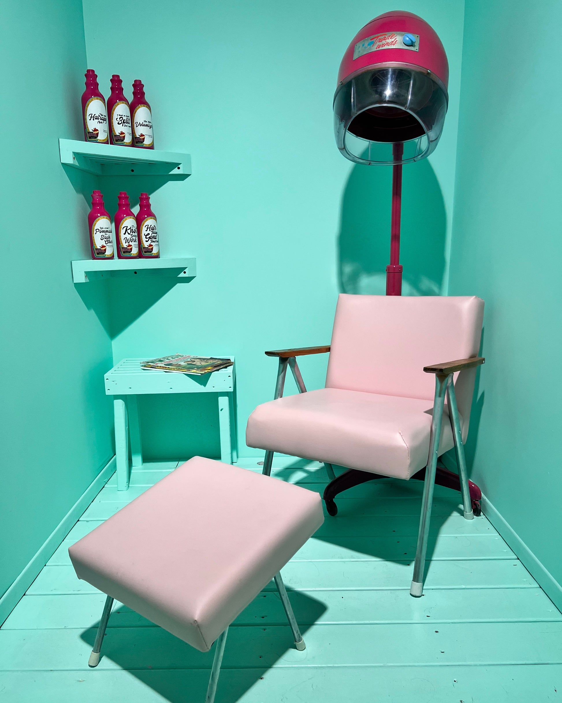 Louez notre ensemble de salon de coiffure ! Comprend une chaise vintage rose, un ottoman rose, un sèche-cheveux vintage authentique et des bouteilles de shampooing.