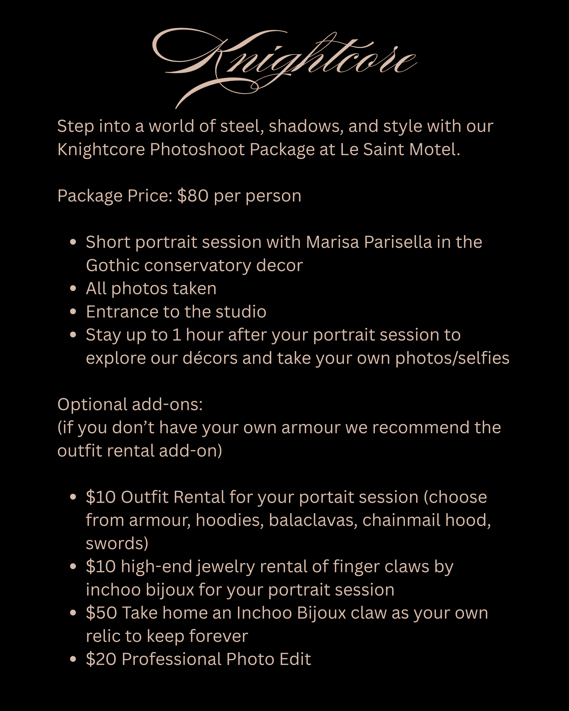 Plongez dans un monde d’acier, d’ombres et de style avec notre forfait photoshoot Knightcore au Saint Motel.