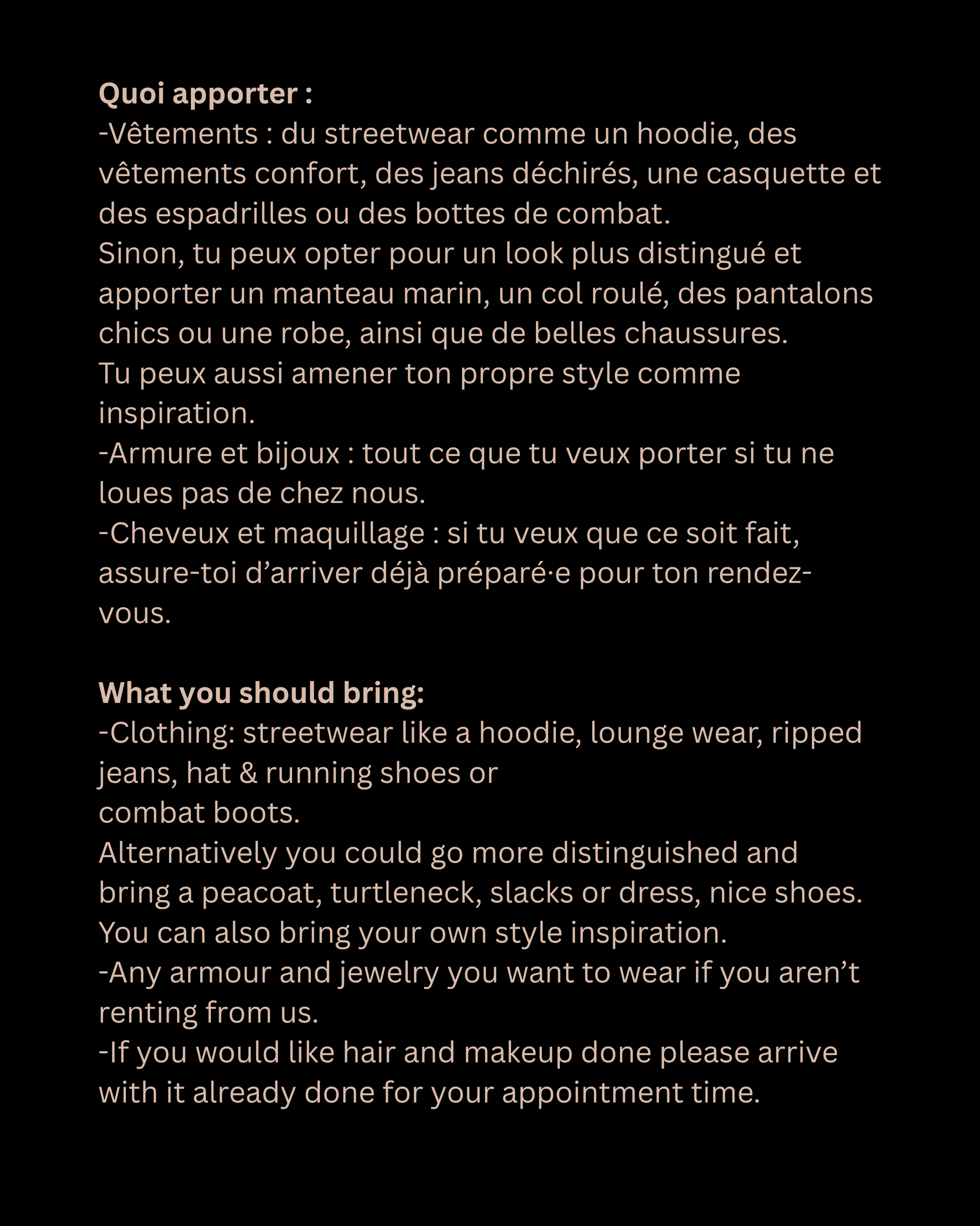 - 10 $ Location de tenue pour votre séance portrait (choix d’armure, hoodies, cagoules, coiffe en cotte de mailles, épées)