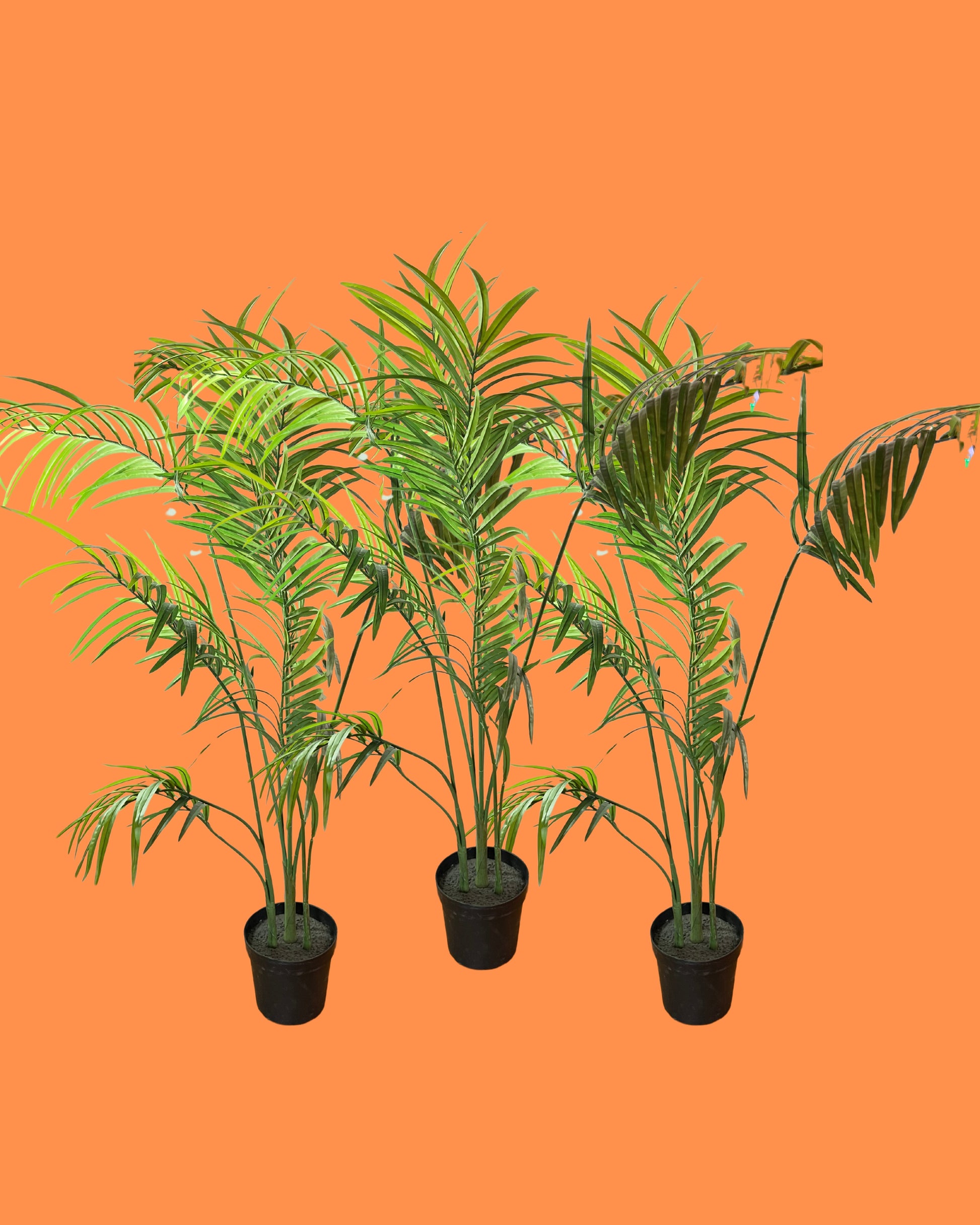 Louez nos palmiers de 5 pieds. Nous en avons deux avec des accents dorés et quatre palmiers à feuillage régulier. Le prix de location est par palmier.