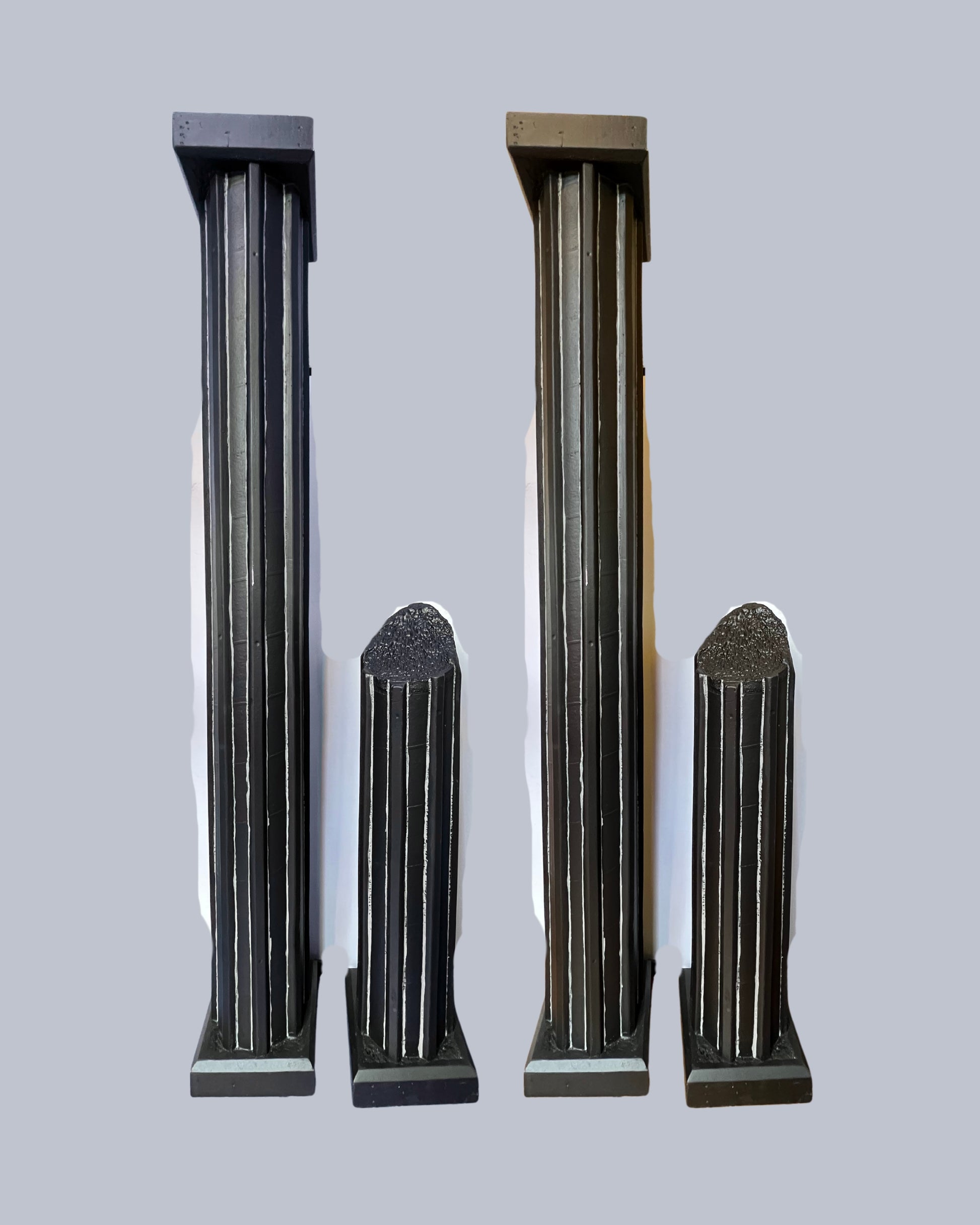 Ensemble de quatre piliers noirs mesurant entre 1,2 m et 2,4 m. Ils sont très légers et mobiles.