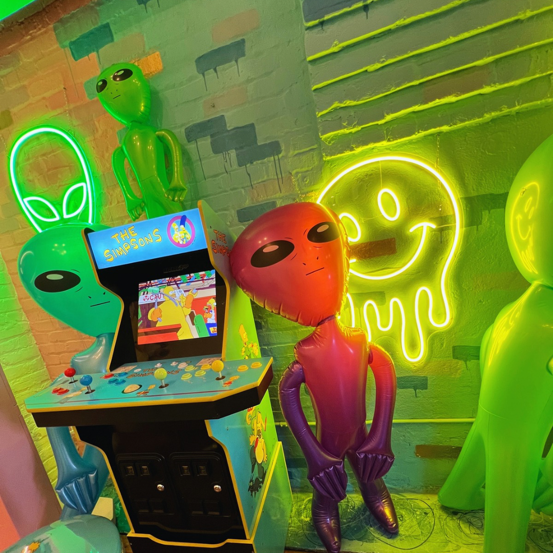 90s inspired arcades that are free to play! You will love taking shots with our colorful brick wall and neon lights! Now with a claw machine and fun prizes!