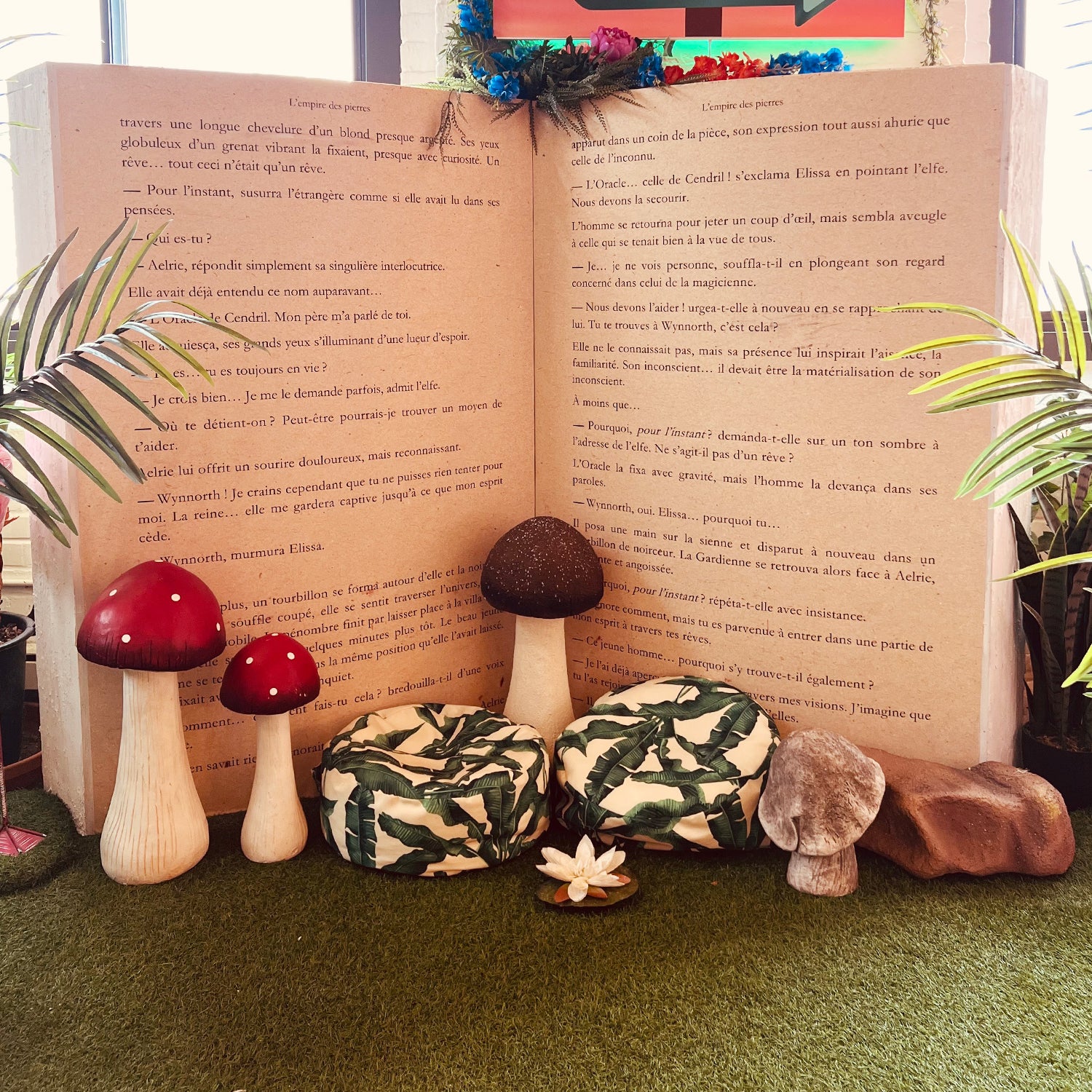 This decor features a giant book written by Montreal author Stephanie van Rijn (An Empire of Stones) and it's open to her favorite passage of the book!