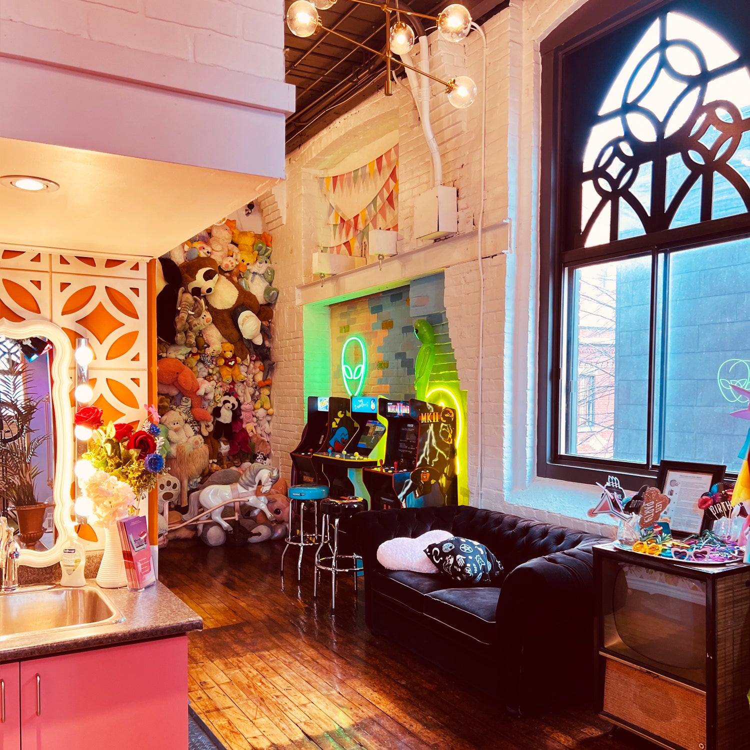 It's not a roadside motel if it doesn't have a unique outdoor pool! Come splash in our Pink Heart Shaped Ball Pit with a beautiful hand painted mural of Montreal's skyline featuring the Farine Five Roses neon. Suspended above the pool is a strand of balls from Montreal's iconic 18 Shades of Gay by Claude Cormier (from the Gay Village installation)
