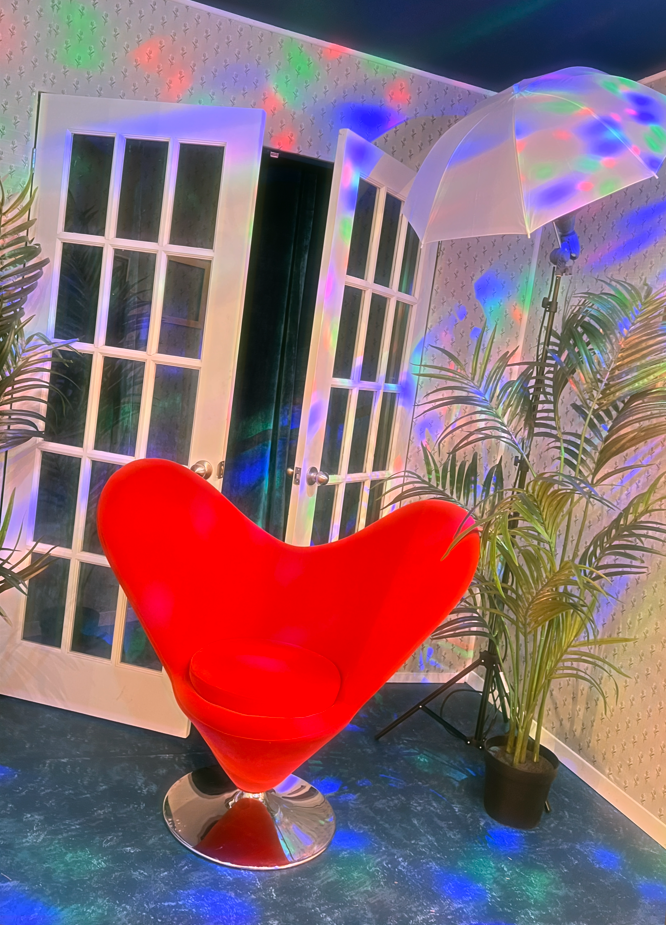 Listen to Donna Summer and spin around in our genuine vintage ball chair! The disco ball actually spins and the trippy patterns are sure to make every photo great!